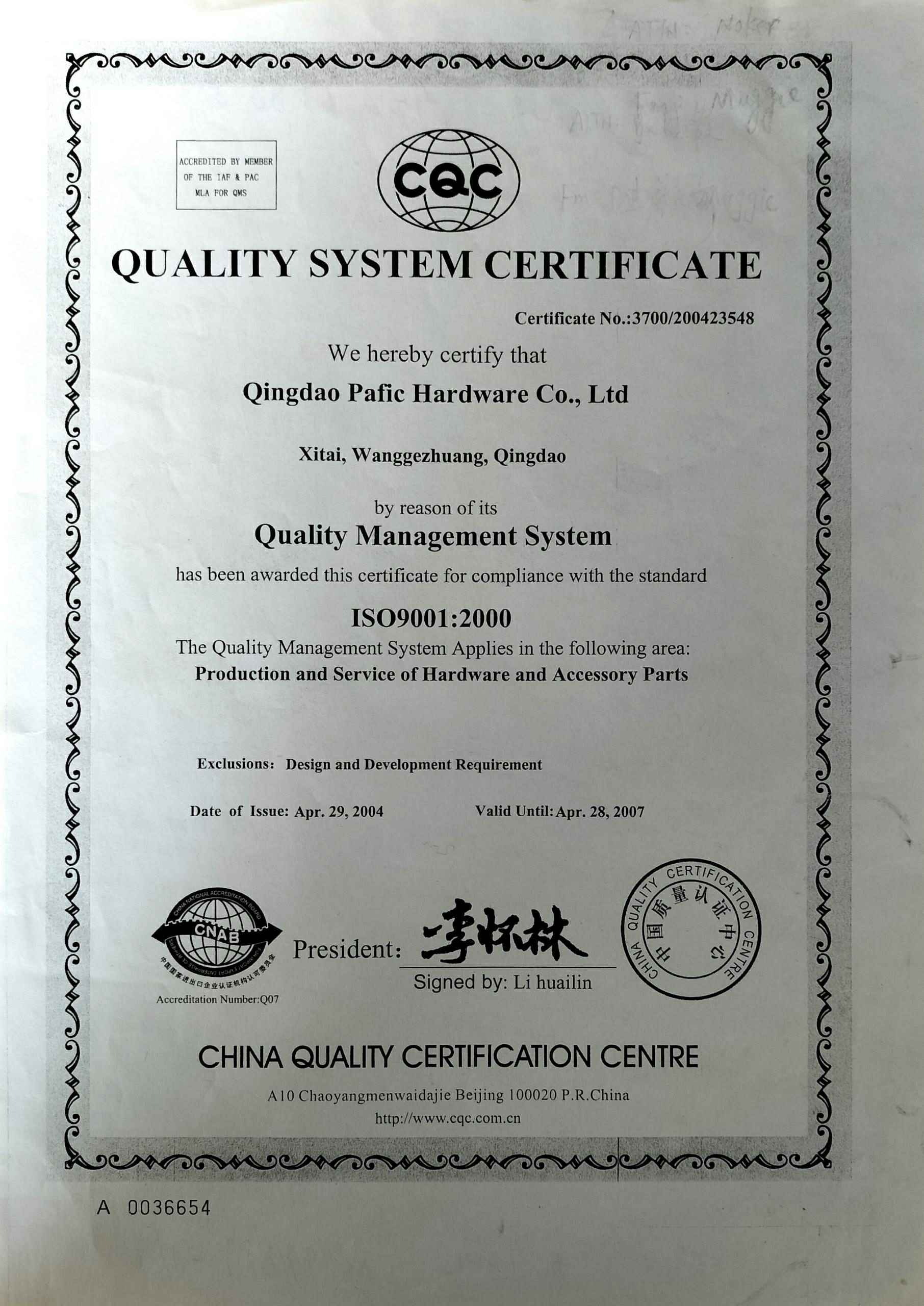 自2002年,经过一年多的培训学习,公司于2004年第一次通过ISO9001:2000 质量管理体系认证,成为青岛中小型企业第一批获得体系认证的公司之一。通过几年的实践,落地实施,反复不断地提升,公司确立“持久好品质”为公司的质量方针,实现从追求完美到客户满意好品质的务实调整,并强调持久的战略选择。